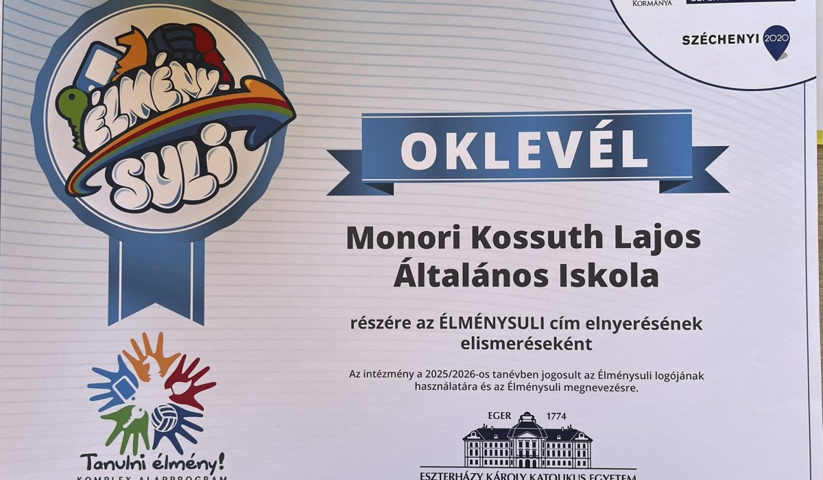 A Monori Kossuth Lajos Általános Iskola a 2025/2026- os tanévre elnyerte az Eszterházy Károly Katolikus Egyetem Komplex Alapprogramjának intézményi megvalósításáért járó ÉLMÉNYSULI címet!